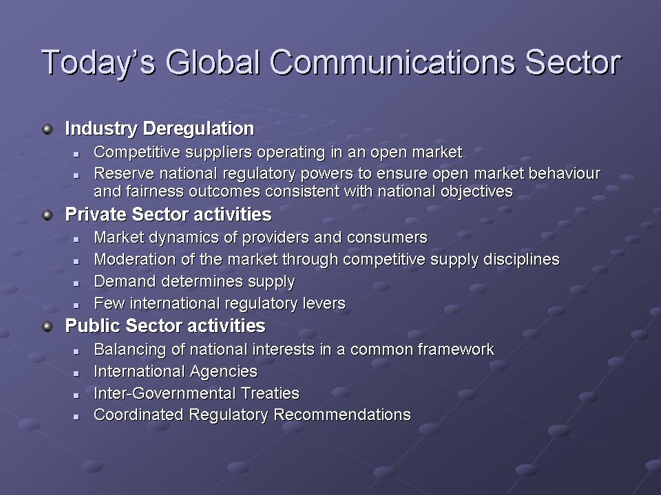 The progressive deregulation of this industry is not an accident. Given that the price-based barriers to entry for competitive providers are coming down, and given the increased capability of the technology to support more complex operating models that are associated with competitive providers, progressive deregulation of the industry is a natural step. Now communications is a commodity-based service, largely fuelled by private sector investment. We are now seeing the traditional models of defined roles for each player, be it an international carrier, a national inter-exchange carrier, a local access provider, becoming blurred into a mesh of competitive suppliers operating in open competition.