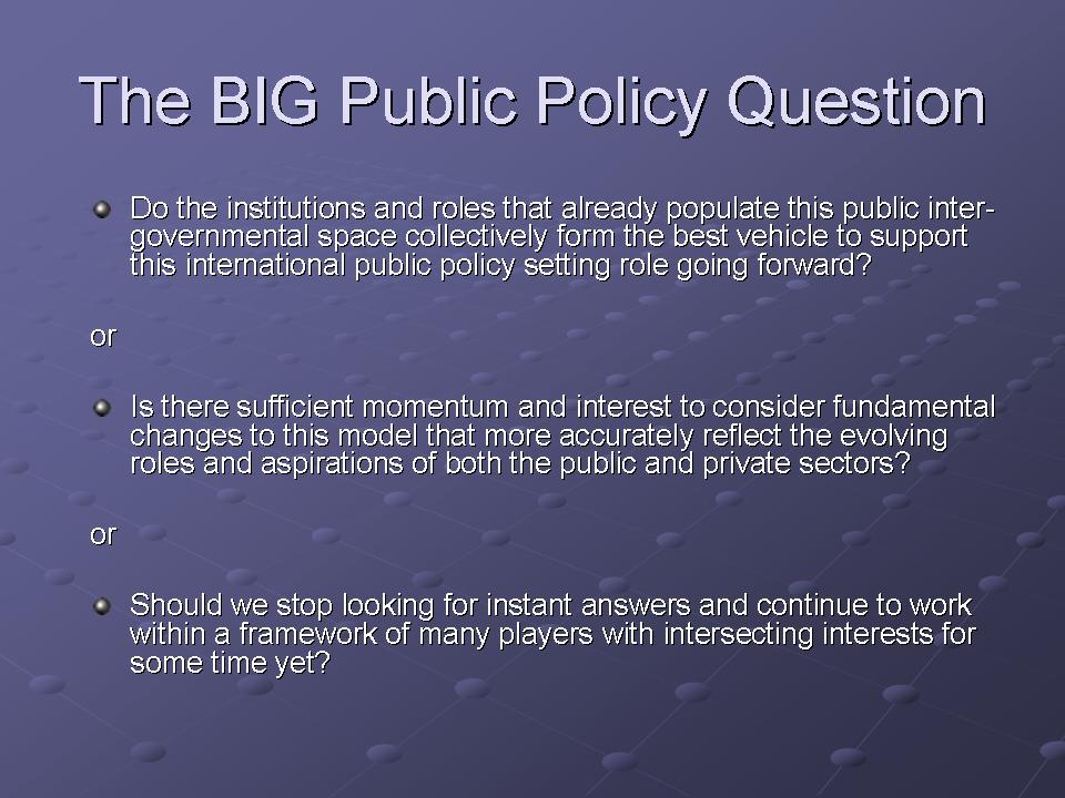 Transcending most of the specific policy issues in today's international communications sector is a larger question pertaining to the institutions that populate the public inter-governmental space. Are the institutions that we currently have in this space the best we can devise? Does their mission, governance structure, constituency base, charter, activity protocol, and mandate match the future requirements for coordination of activity in this sector?