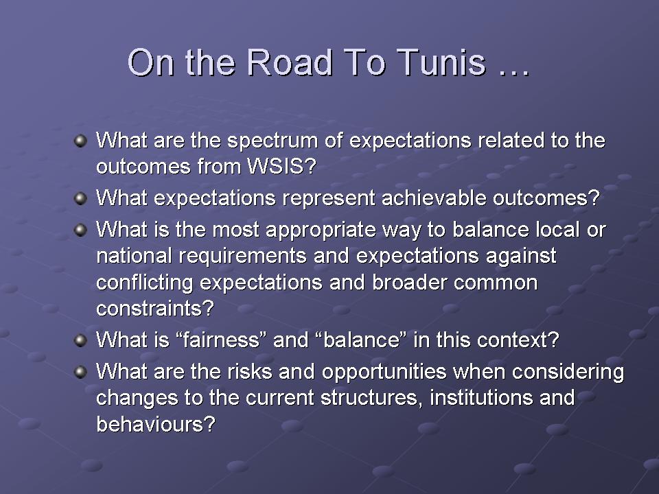 Within the overall framework of the WSIS program there may be scope to pose the questions: "How should the global communications industry charter institutions that accurately reflect the diverse interests of private and public sector players? How should an institutional framework reflect the interests of consumers as well as governments, industry, technology, and broader societal aspirations? How should such institutions reflect industry involvement and industry investment? What are our expectations?