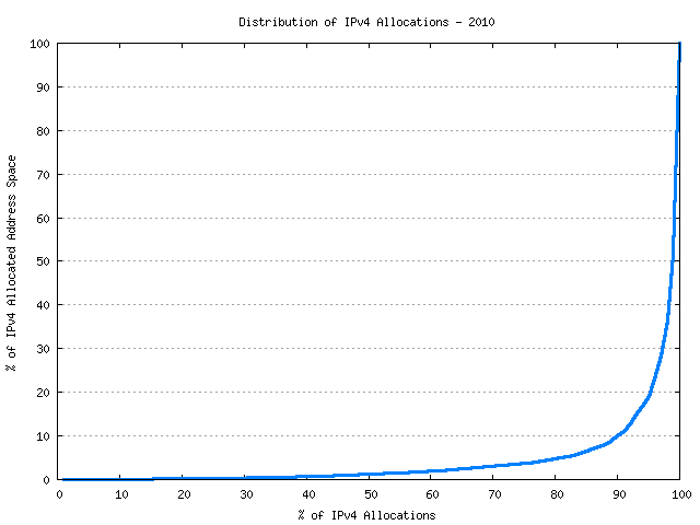 This "heavy tail" distribution of the largest allocations has not always been the case. In looking at the distribution of IPv4 allocations over the past decade the following table shows the percentage of address space that were allocated to the 1% largest individual allocations and the lower half of the individual allocations.