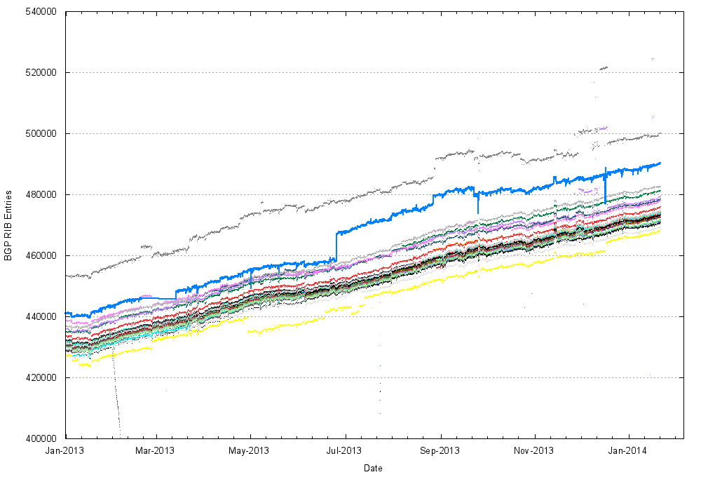 Figure 7 shows the day-by-day progress of the size of the routing table through 2013. There was one notable event, the advertisement of some 10,000 more specific routings on the 25th June. There were four origin ASes that were responsible for the bulk of these additional advertisements: AS7029 (Windstream Communications, US), responsible for an additional 3,606 routes on this day, AS33363 (Bright House Networks, US), responsible for 1,651 additional routes, AS4323 (TW Telecom Holdings, US), for some 1,351 additional routes, and AS9116 (Goldenlines, Israel), for some 348 additional routes. This single day was responsible for some 20% of the entire year’s growth in the size of the routing table for the year. It appears somewhat unlikely that this deaggregation was a coordinated action across a number of origin AS’s, so a more likely explanation is that a change in the routing environment for these particular AS’s, or their upstreams or peers, admitted a set of more specifics routes that had been previously filtered. When we look at the daily view of the routing table from each of the peers of Route Views (www.routeviews.org) (Figure 8), it appears that this is indeed the case, and other peers of Route Views did not see this jump in the number of routes. The data from Route Views suggests that in this case it’s AS6939 (Hurricane Electric) that is allowing this set of more specifics through into some parts of the global routing table. A closer examination, and some followup with some of the AS’s involved here reveals that in the case of AS7029 in particular (Windstream Communications, US), they announce 4,429 specific routes to their peers, while they announce 460 aggregates to their upstreams. While this tends to bias incoming traffic to peer connections, the incremental load that is imposed on the network is a further 4,000 routes on the set of AS’s that have paths that reach AS7029’s peers.