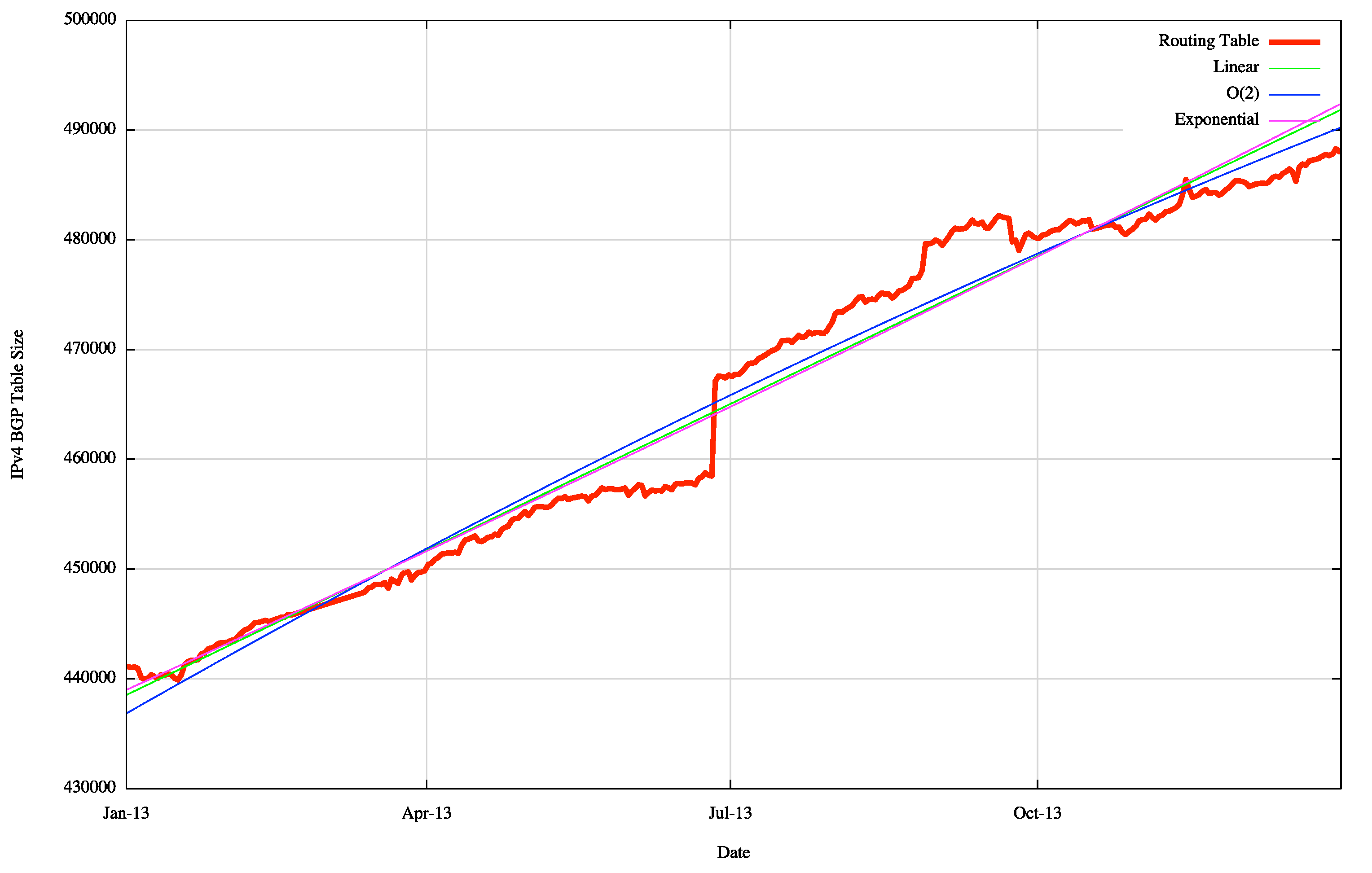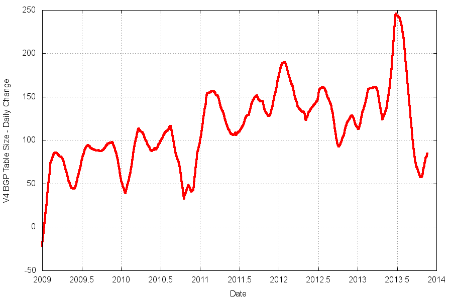 The first order differential, or the rate of growth, of the BGP routing table is shown in Figure 17. The rate of growth of the routing table appears to be increasing in the period 2009 to 2012. With the exception of the single mid-2013 deaggregation event, the table growth in 2013 is at much the same level as 2012. If the first order differential matches a flat line, then the data set matches a linear slope. This is strongly indicative of a recent growth trend that is closer to a constant growth model than that of compound growth.