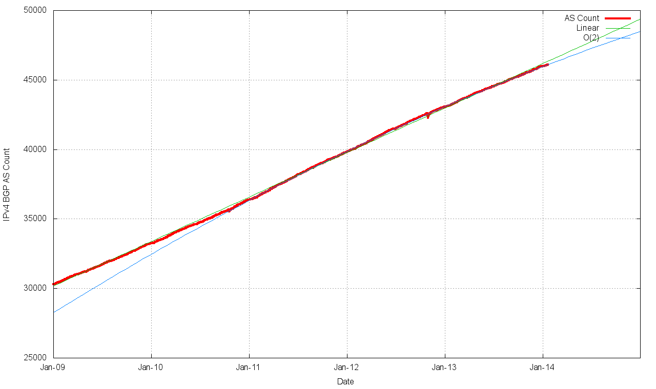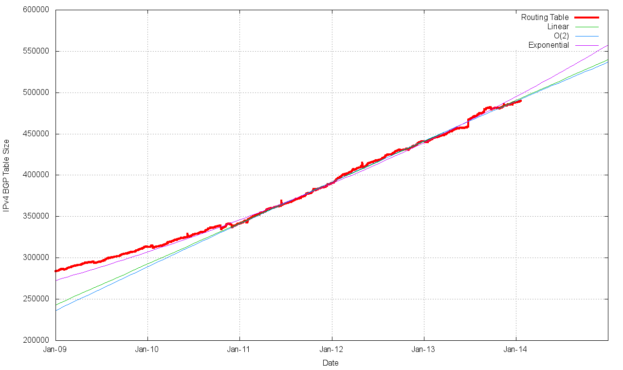 At the outset it's appropriate to observe that this is a time of extreme uncertainty in the BGP prediction business! The run out of the IPv4 address pool in the Asia Pacific region and in Europe and the Middle East will be followed by a similar run down event for North and South America, currently anticipated to occur in late 2014. What was observed in the Asia Pacific region was an initial dampening on the growth in the address table, but then an acceleration in growth coming from the advertisement of smaller prefixes. It remains to be seen what will occur in the Americas, post exhaustion.