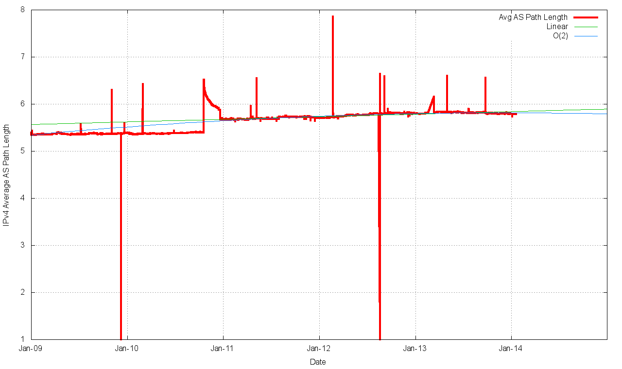 Other observations about the trends of the IPv4 BGP routing system include noting that the use (or abuse!) of more specifics in the routing system has not improved, nor has it become significantly worse. The average size of advertisements getting smaller in terms of address span per routing table entry, as is the span of originating addresses per origin AS, which appears to be an outcome of IPv4 address exhaustion, which is forcing a number of providers to increase their efficiency of use of public IPv4 addresses.