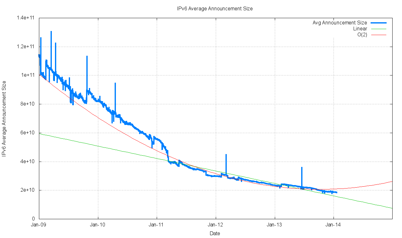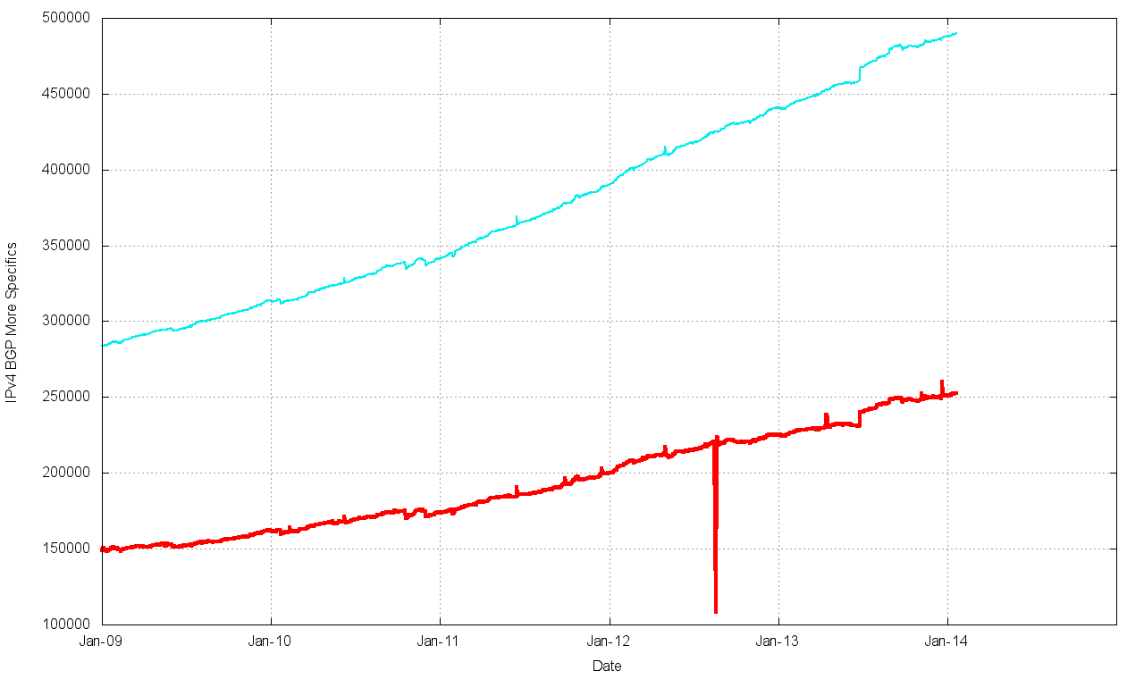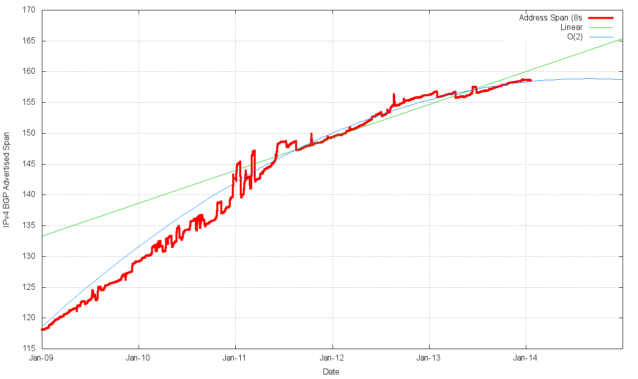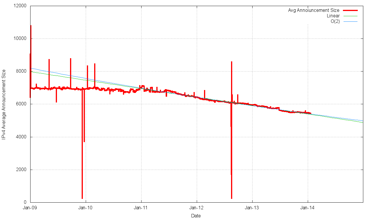 Over this period there is one significant event, namely the exhaustion of the IPv4 address space pools in APNIC in April 2011 (serving the Asia Pacific region) and in the RIPE NCC in September 2012 (serving Europe and the Middle East). The three year period since the start of 2011 has seen the span of addresses advertised in the routing system slowing down (Figure 5). However, at the same time there has been a higher level of growth in the number of entries in the routing table over the 2011 – 2013 period than was visible in the preceding two year 2009 – 2010 period. The result of these two factors is that the average announcement in the IPv4 routing table is spanning fewer addresses, or, to put it another way, the granularity of the IPv4 routing space is getting finer. As Figure 4 shows, while the period 2009 – 2010 the average announcement size was a steady 7,000 addresses, in the period since the start of 2011 the average announcement size has fallen to 5,500 addresses at the start of 2014.