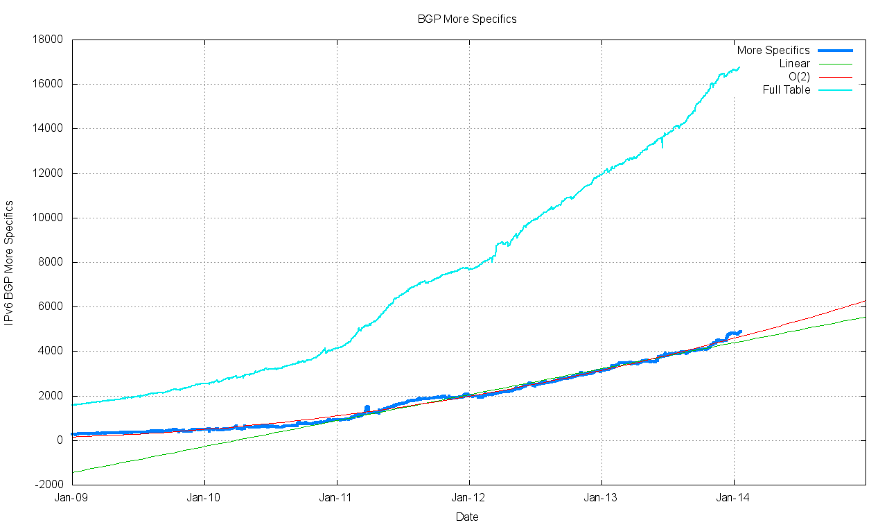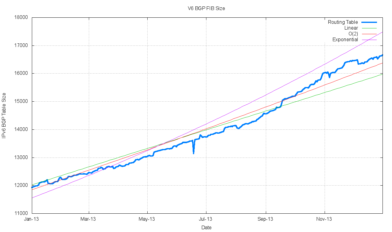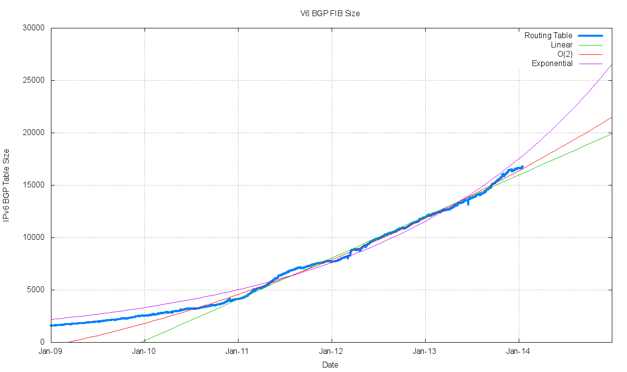 The exponential and polynomial projections in Table 4 provide a reasonable estimate of the high and low bounds of the growth of the IPv6 BGP routing table in the coming years. It should be noted that while the high bound of this growth curve tends to a growth profile that is close to the parameters of Moore’s Law with a doubling interval of some 22 months, the mitigating factor is that these numbers are not exactly massive numbers, and in five years time we would be expecting a IPv4 BGP table size of 740,000 entries, or some of times the size of the higher bound of expectations for the IPv6 routing table.