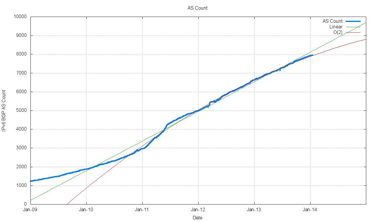 This implies that a linear growth model is inappropriate for modelling growth in IPv6. A better fit to the data is a compound growth model, with a doubling factor of some 22 months. It is possible to fit a linear model to the first order differential of the data, which can be used to derive an O(2) polynomial fit to the original data. The fit of a linear, O(2) polynomial and an exponential model against the data is also shown in Figure 20.