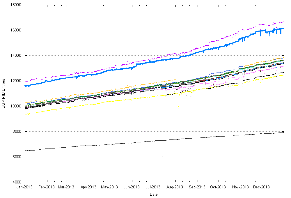 Figure 15 – IPv6 BGP Table in 2013, as seen by peers of Route Views