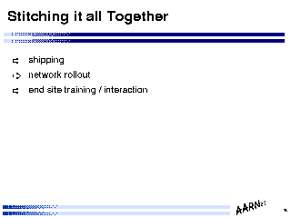 The next area to examine is the actual roll out of the network services. If this has been well coordinated this phase should be relatively rapid. The major piece of advice is to understand the environment where each routing unit is to be deployed, and pre-configure the unit to match this. In this way the units can be shipped pre-configured, and deployment is then a matter of interconnecting the various LAN and WAN interface cables.